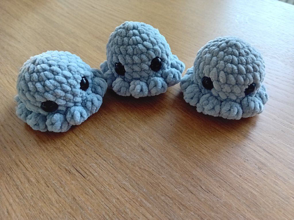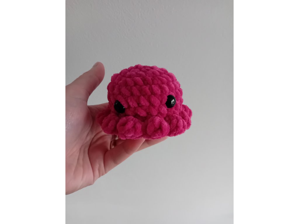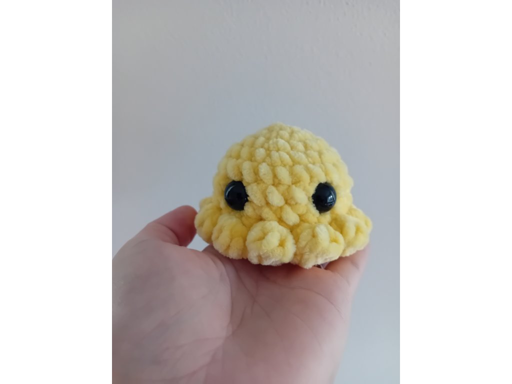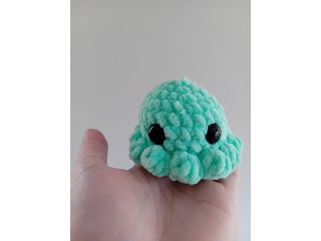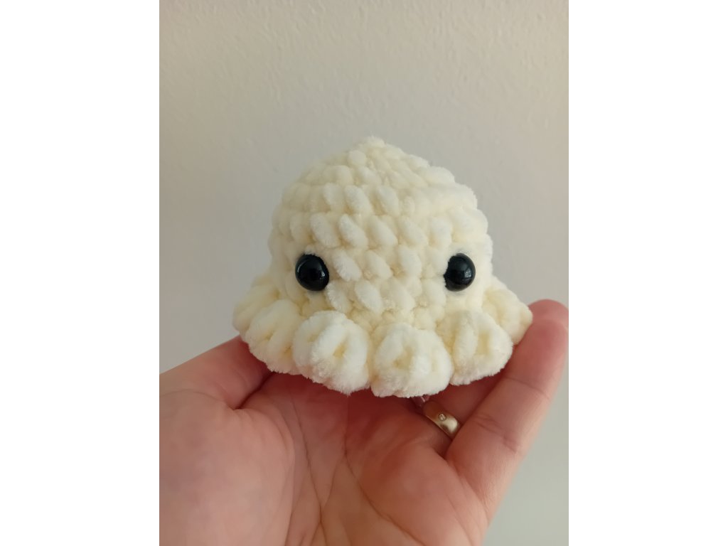 Malá, roztomilá chobotnice je háčkovaná ze 100 % polyesterové příze. Je měkoučká a velice příjemná na omak. Plněná je dutým vláknem, oči jsou bezpečnostní. Průměr má 9 cm a na výšku 6 cm.